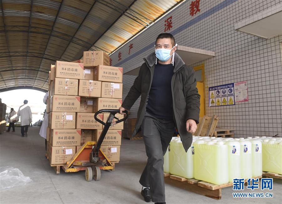 1月29日,成都一家公司工人在运送成品消毒液。该公司目前满负荷生产消毒用品,供应市场。 近日,各地采取多种措施,加强对新型冠状病毒感染的肺炎疫情防控。 新华社记者刘坤摄