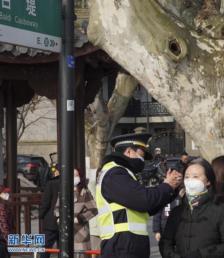 1月29日,在西湖白堤入口处,工作人员在对进入白堤的游客开展体温检测。 近日,各地采取多种措施,加强对新型冠状病毒感染的肺炎疫情防控。 新华社记者 李亚彪 摄