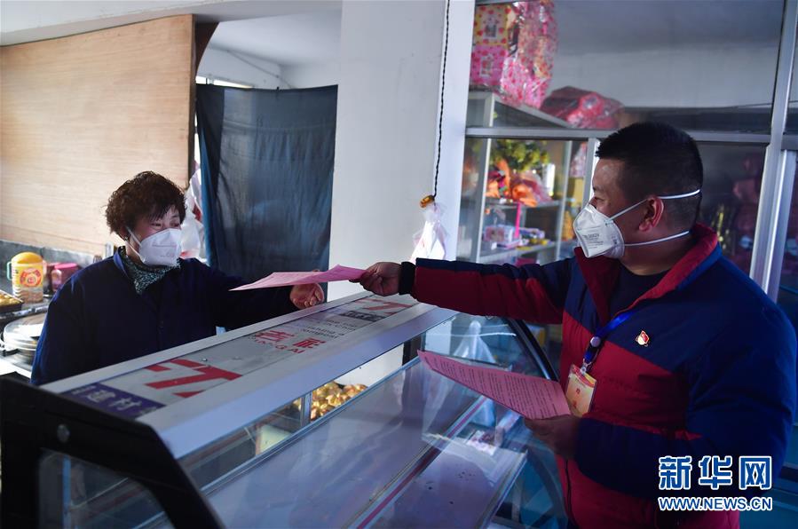 1月29日,青海省西宁市大通回族土族自治县黄家寨镇黄西村工作人员对村内商户进行防疫宣传。 近日,各地采取多种措施,加强对新型冠状病毒感染的肺炎疫情防控。 新华社记者 张龙摄