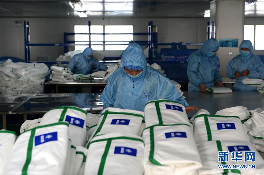 1月30日,在合肥高贝斯医疗卫生用品有限公司,工人在包装防护服。 为助力抗击新型冠状病毒感染的肺炎疫情,位于安徽省肥东县的合肥高贝斯医疗卫生用品有限公司提前复工生产,加班加点赶制防护服。 新华社发(黄博涵摄)