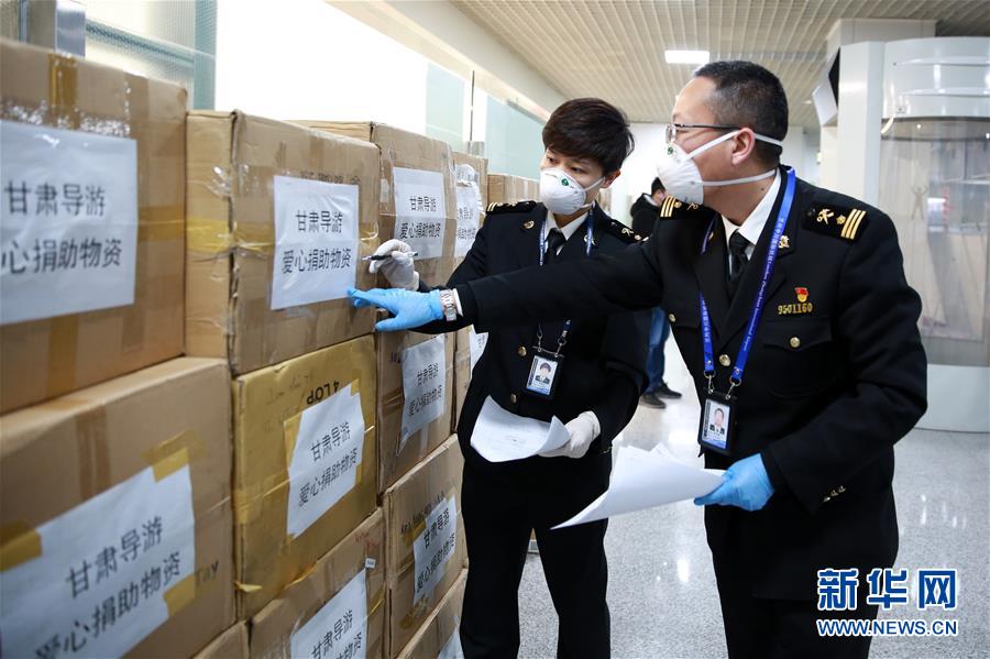 1月30日, 在兰州中川国际机场,海关工作人员快速验放境外捐赠的医用口罩。 当日,两批12.2万只境外捐赠医用口罩从越南空运至兰州中川国际机场,兰州海关快速开启防控物资绿色通道,对进口救援物资实行“7×24小时”通关,确保境外捐赠物资随到随验、快速通关,保障捐赠物资快速通关运抵疫情防控一线。据介绍,这两批医用口罩,均为甘肃导游爱心团和部分华人组织向甘肃省红十字会捐赠,最终交由兰州市相关医院、防控工作指挥部等单位使用。 新华社发(杨晓琴 摄)