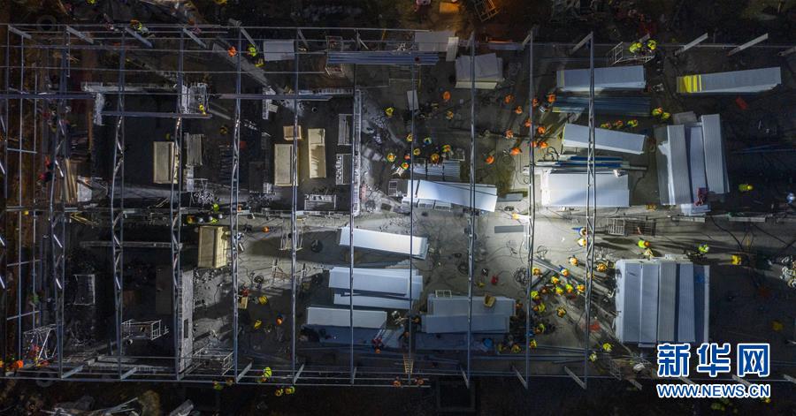 1月30日,在武汉火神山医院建设工地,来自中建三局的工人在加紧施工(无人机照片)。新华社记者 才扬 摄
