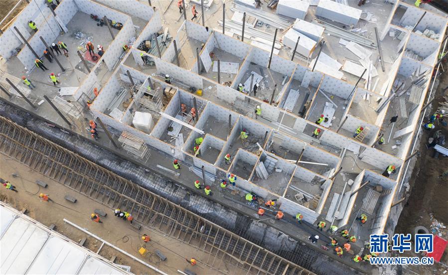 1月30日,在武汉火神山医院建设工地,来自中建三局的工人在加紧施工(无人机照片)。新华社记者 才扬 摄