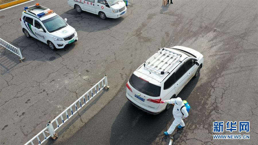 1月29日,在京港澳高速许昌站出口,工作人员为过往车辆消毒。新华社发(牛书培 摄)