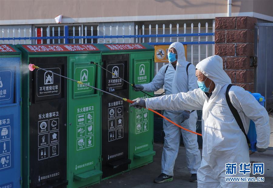 1月30日,在山东荣成斥山街道东火塘寨村,村民们在对垃圾箱进行消毒杀菌作业。新华社发(李信君 摄)