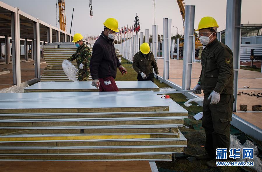 1月30日,在武汉雷神山医院建设工地,来自中建三局的工人在加紧施工。新华社记者 肖艺九 摄