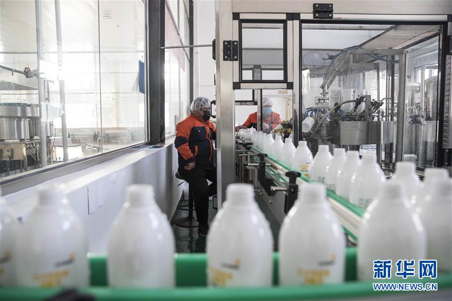 1月31日,在哈尔滨大荒环宇新技术有限公司生产车间内,工人们生产消毒液。 春节假期期间,哈尔滨大荒环宇新技术有限公司提前复工生产,为奋战在新型冠状病毒感染的肺炎疫情防控一线的医护人员和广大市民提供消毒物资保障。 新华社发(张涛 摄)