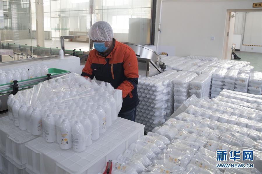 1月31日,在哈尔滨大荒环宇新技术有限公司生产车间内,工人摆放消毒液的瓶子。 春节假期期间,哈尔滨大荒环宇新技术有限公司提前复工生产,为奋战在新型冠状病毒感染的肺炎疫情防控一线的医护人员和广大市民提供消毒物资保障。 新华社发(张涛 摄)