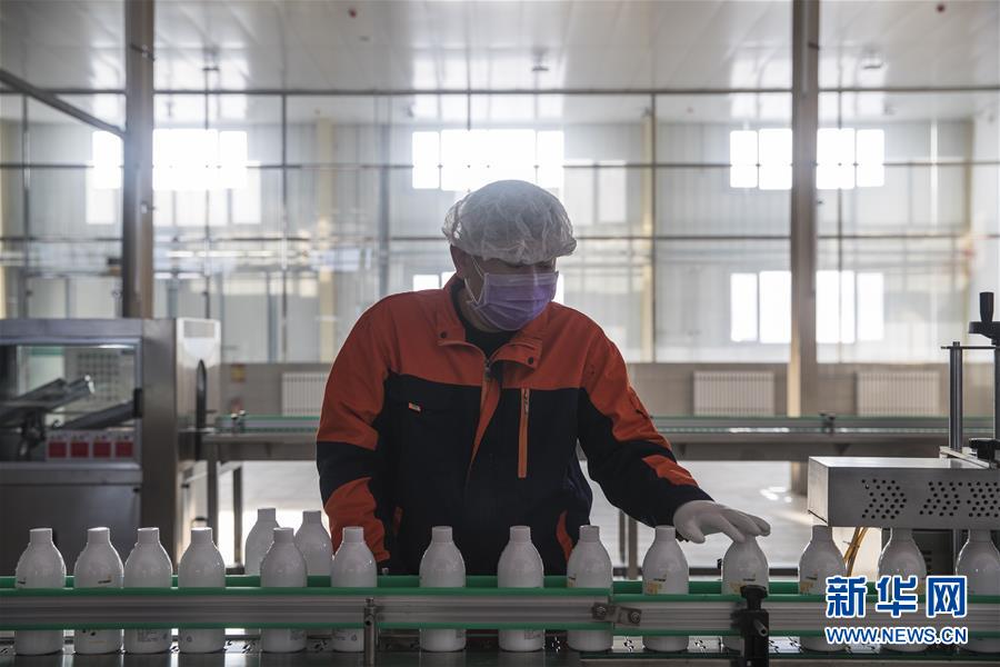 1月31日,在哈尔滨大荒环宇新技术有限公司生产车间内,工人对消毒液进行检查。 春节假期期间,哈尔滨大荒环宇新技术有限公司提前复工生产,为奋战在新型冠状病毒感染的肺炎疫情防控一线的医护人员和广大市民提供消毒物资保障。 新华社发(张涛 摄)