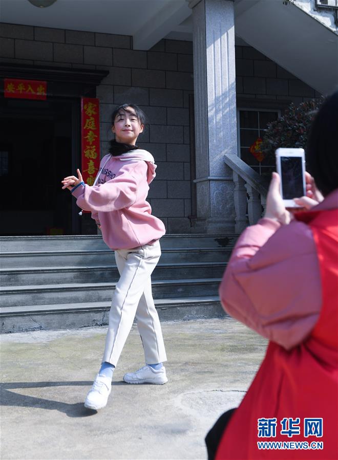 1月31日,中泰街道岑岭村12岁的小姑娘李易冉(左)擅长舞蹈,她利用春节在家时间,把国标舞的基础知识和动作录成视频,供大家欣赏和学习。 近期,受新型冠状病毒感染的肺炎疫情影响,浙江省杭州市余杭区中泰街道下属14个村(社)的乡村百姓基本取消了走亲访友的计划,为了丰富这些山村百姓的居家文化生活,中泰街道党员志愿者通过微信、抖音发起线上活动,开辟“网上乡土娱乐大舞台”,让有才艺的村民百姓通过手机视频展示才艺,集娱乐和教学于一体,让老百姓不出门也能参与到丰富的文化娱乐活动中去。 新华社记者 徐昱 摄