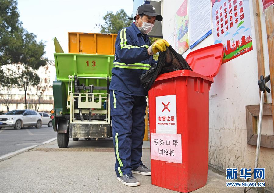 1月31日,在南昌市红谷滩新区卫东花园小区,沙井街道综管办的环卫工人在处理废弃口罩。 新型冠状病毒感染的肺炎疫情发生后,口罩使用量剧增。近日,江西省南昌市在各城区设置废弃口罩专用垃圾桶1万余个,号召市民正确处理废弃口罩。收集到的废弃口罩将由环卫部门进行专车运输、定点处理。 新华社记者 万象 摄