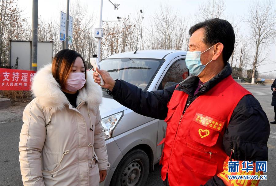 1月31日,河北廊坊市安次区北史家务乡工作人员为居民测量体温。 近日,各地积极采取多种措施,加强对新型冠状病毒感染的肺炎疫情防控。 新华社发(刘建斌 摄)