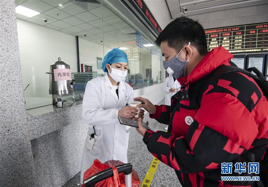 1月31日,江西省吉安市新干县中医院党员志愿者在新干东站候车厅给旅客送中药代茶汤剂。 近日,各地积极采取多种措施,加强对新型冠状病毒感染的肺炎疫情防控。 新华社发(李福孙 摄)