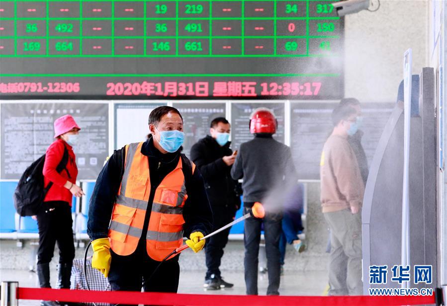 1月31日,在江西省吉安市泰和县火车站,工作人员对候车大厅进行消毒。 近日,各地积极采取多种措施,加强对新型冠状病毒感染的肺炎疫情防控。 新华社发(司马天民 摄)