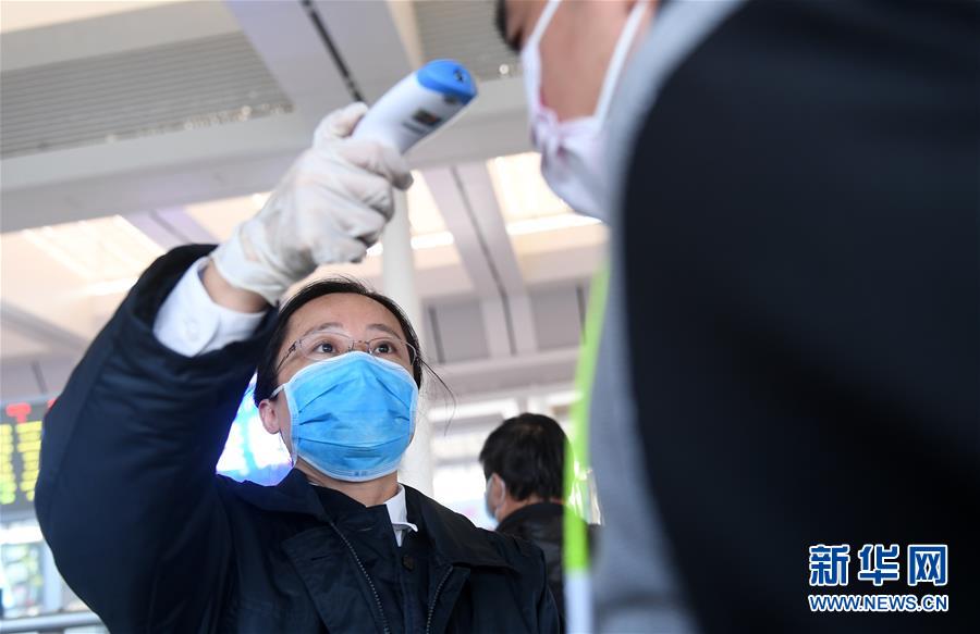 1月31日,广西南宁东站工作人员(左)对进站旅客测量体温。 近日,各地积极采取多种措施,加强对新型冠状病毒感染的肺炎疫情防控。 新华社记者 陆波岸 摄