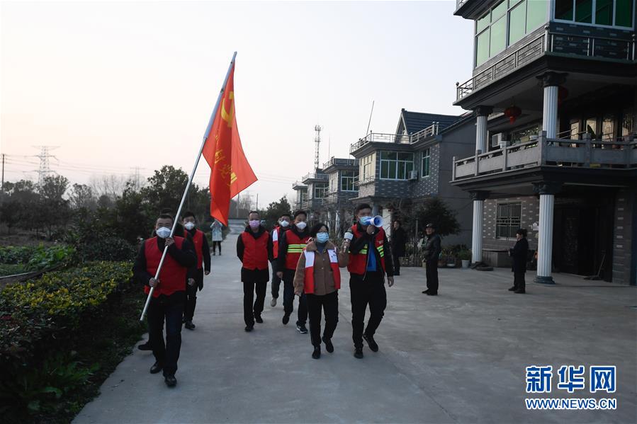 1月31日,南浔区千金镇金城村党员志愿者巡逻队在村庄进行防疫宣传。 近日,浙江省湖州市南浔区组织党员干部下沉到疫情防控工作第一线,坚持群防群治,300多名防疫志愿者培训上岗,充分运用“大数据+网格化”等手段,精准滚动排摸,落实管控措施和服务举措。 新华社记者 黄宗治 摄