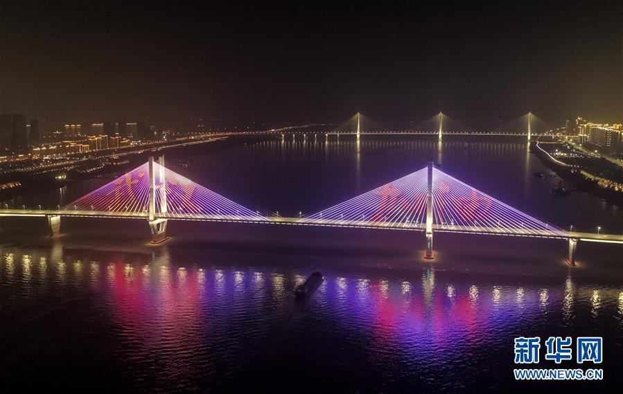 1月31日,武汉长江二桥打出“武汉加油”字样(无人机照片)。 新华社记者 程敏 摄