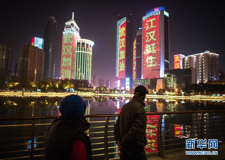 1月31日,武汉市江汉区西北湖附近高层建筑外墙打出“武汉加油”等字样。 新华社记者 肖艺九 摄
