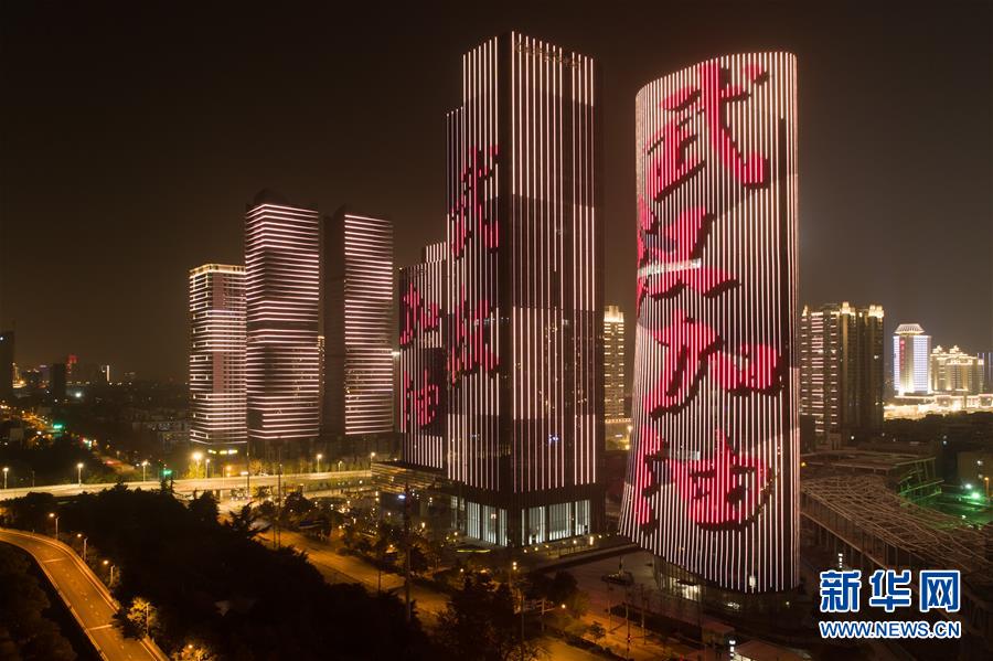 1月31日,武汉市武昌区高层建筑外墙打出“武汉加油”字样(无人机照片)。 新华社记者 程敏 摄