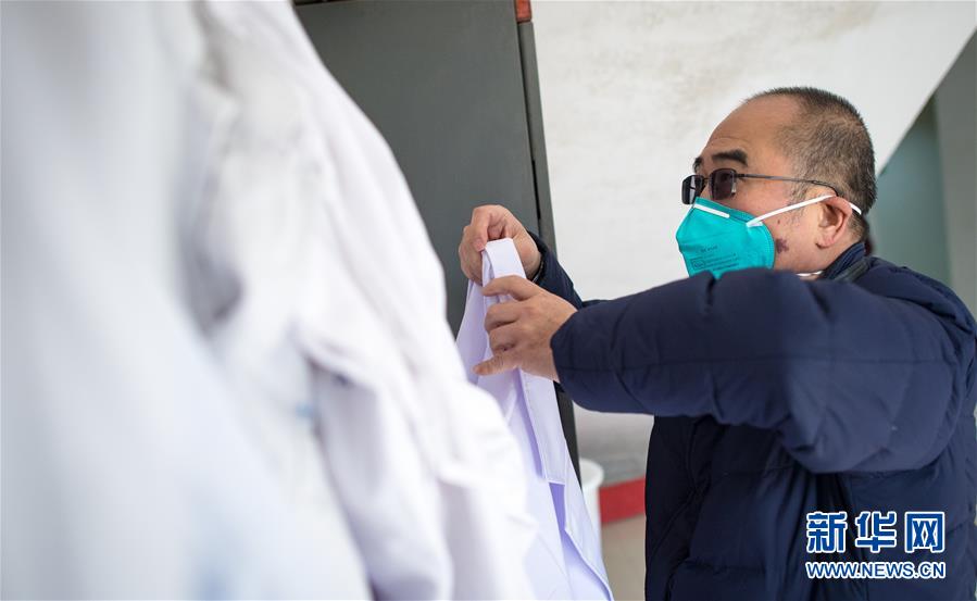 1月29日,武汉金银潭医院院长张定宇回到医院后马上换装投入工作。新华社记者 肖艺九 摄