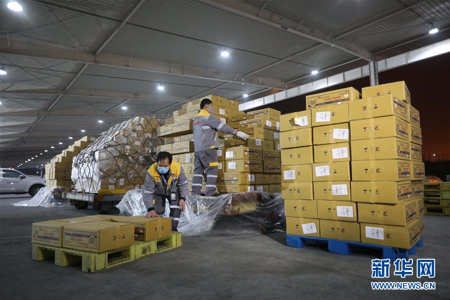 1月31日晚,工作人员在重庆江北国际机场“疫情防控急缺物资绿色通道”专用货仓内对货物进行分类整理。 新华社发
