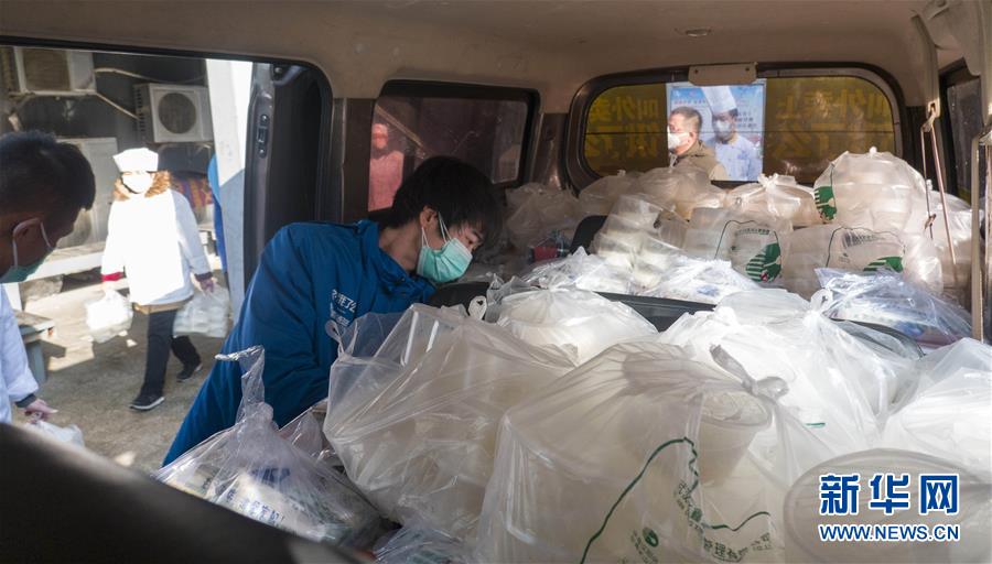 1月31日,在武汉汉阳区东鑫酒店门外,外卖小哥谭康在向货车内搬运盒饭。新华社记者 才扬 摄
