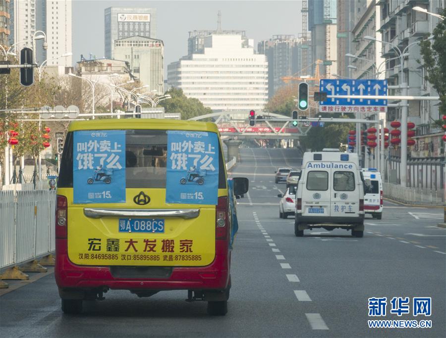1月31日,装有500份外卖的小货车行驶在武汉空旷的马路上,路上“偶遇”两辆救护车。新华社记者 才扬 摄