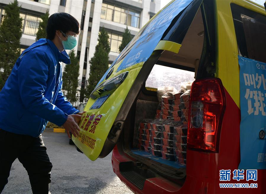 1月31日,外卖小哥谭康关闭运送盒饭的货车门准备出发。新华社记者 李贺 摄