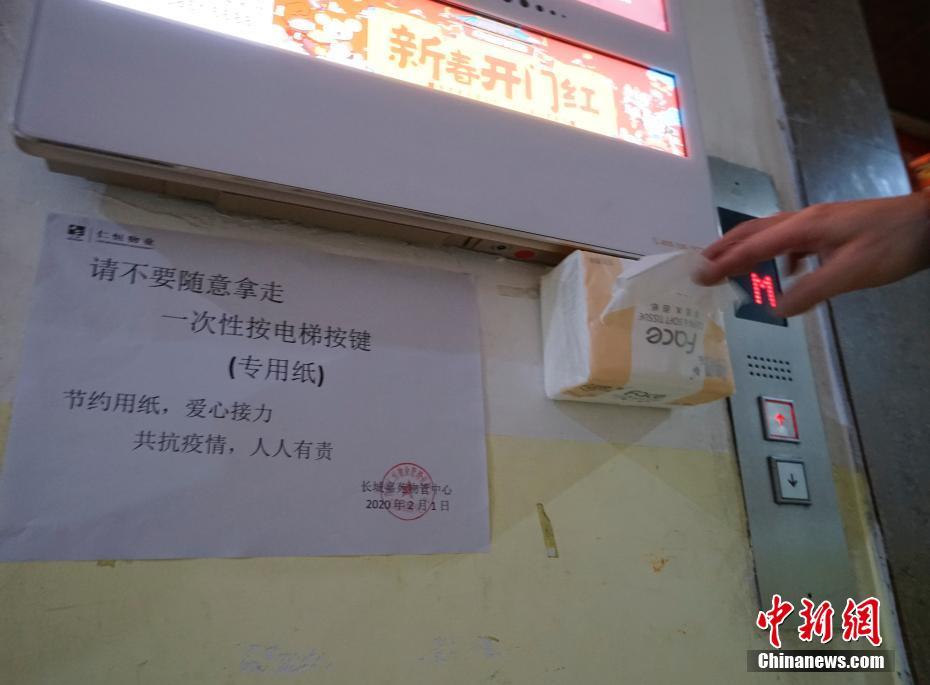 贵州省贵阳市的一处居民小区等候电梯处,物业管理方设置有一次性按电梯按键专用纸,以减少新型冠状病毒感染的肺炎传染的机会。中新社记者 侯宇 摄