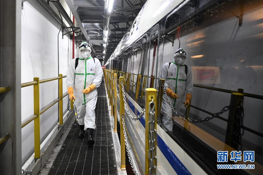 2月2日,工作人员在消毒完毕后从动车组内走出。 为做好新型冠状病毒感染的肺炎疫情防控工作,保障乘客安全,中国铁路成都局集团有限公司重庆车辆段联合重庆疾控所对列车进行严格细致的消毒防疫工作。 新华社记者 唐奕 摄