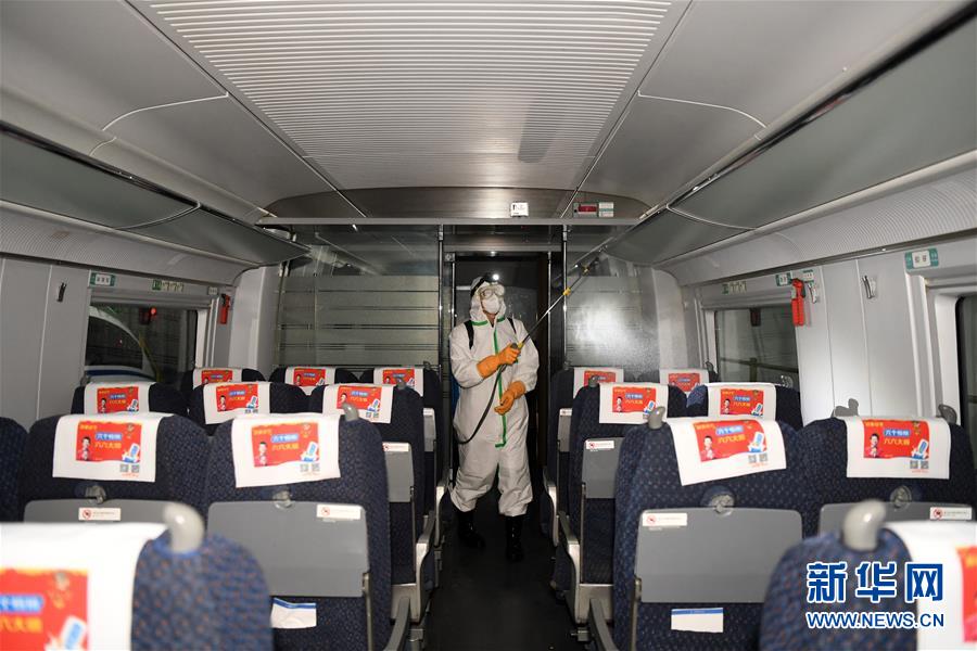 2月2日,工作人员对动车组车厢进行消毒。 为做好新型冠状病毒感染的肺炎疫情防控工作,保障乘客安全,中国铁路成都局集团有限公司重庆车辆段联合重庆疾控所对列车进行严格细致的消毒防疫工作。 新华社记者 唐奕 摄