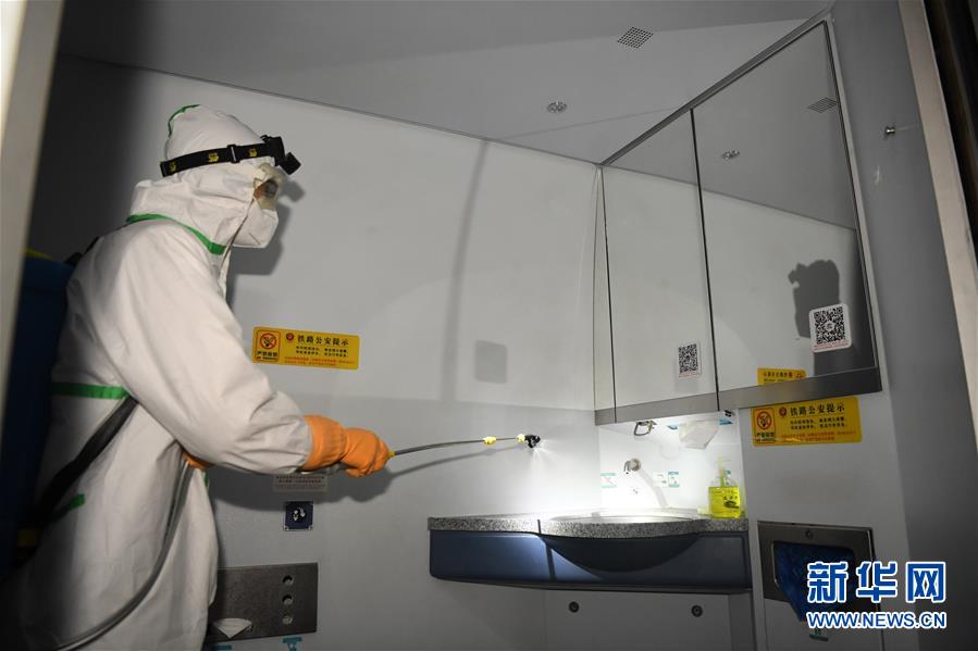 2月2日,工作人员对车厢内卫生间洗手池进行重点消毒。 为做好新型冠状病毒感染的肺炎疫情防控工作,保障乘客安全,中国铁路成都局集团有限公司重庆车辆段联合重庆疾控所对列车进行严格细致的消毒防疫工作。 新华社记者 唐奕 摄