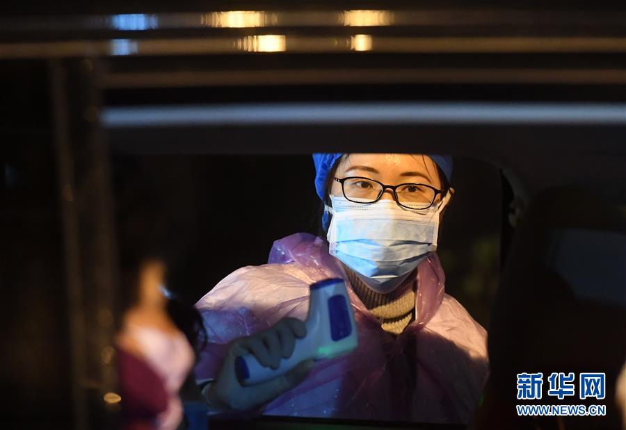 2月2日晚,在广西柳州东高速公路收费站出口,兰妮对入城车辆司乘人员进行体温检测。 新华社发(黎寒池 摄)