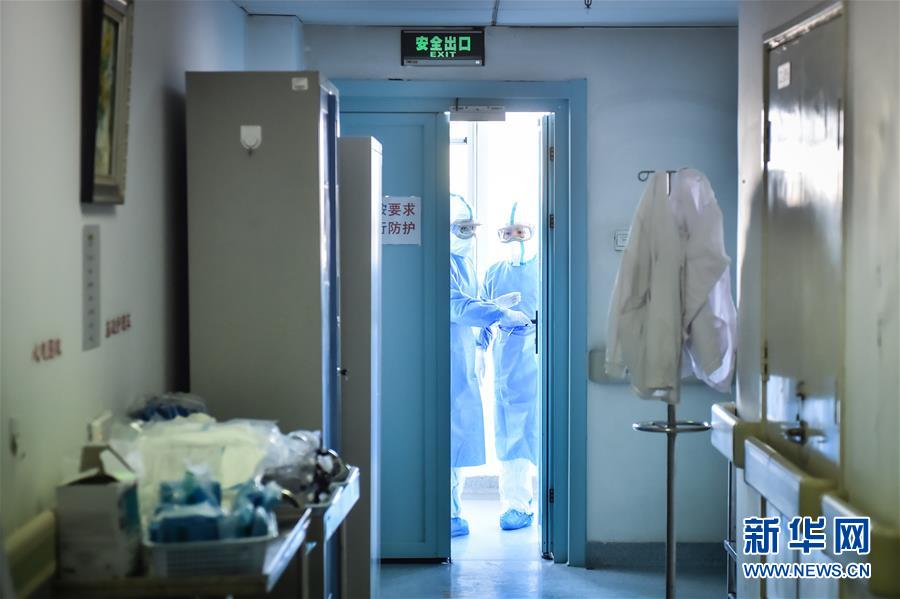 2月3日,北京地坛医院的病房外,护士们穿戴好防护装备后进入病房区。 当日,记者探访北京市新型冠状病毒感染的肺炎定点医院之一的地坛医院,目前该院已腾出三个普通病区和一个重症监护病房应对疫情。 新华社发(彭子洋 摄)