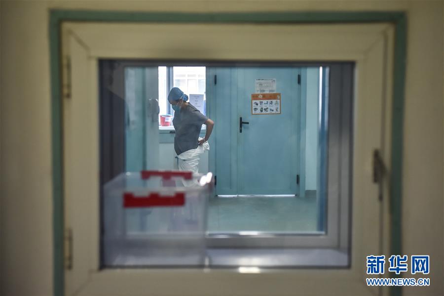 2月3日,北京地坛医院的半污染房间里,准备出污染区的护士脱下防护服。 当日,记者探访北京市新型冠状病毒感染的肺炎定点医院之一的地坛医院,目前该院已腾出三个普通病区和一个重症监护病房应对疫情。 新华社发(彭子洋 摄)