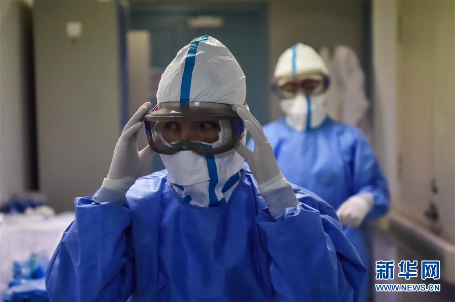 2月3日,北京地坛医院的病房外,护士们在穿防护服带护目镜。 当日,记者探访北京市新型冠状病毒感染的肺炎定点医院之一的地坛医院,目前该院已腾出三个普通病区和一个重症监护病房应对疫情。 新华社发(彭子洋 摄)