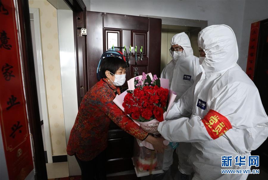 2月3日,山东省临沂市沂南县界湖街道党员志愿者为居家隔离的群众送来鲜花和生日蛋糕。 面对新型冠状病毒感染的肺炎疫情,人们纷纷献出爱心,温暖着身边的人。 新华社发(杜昱葆 摄)