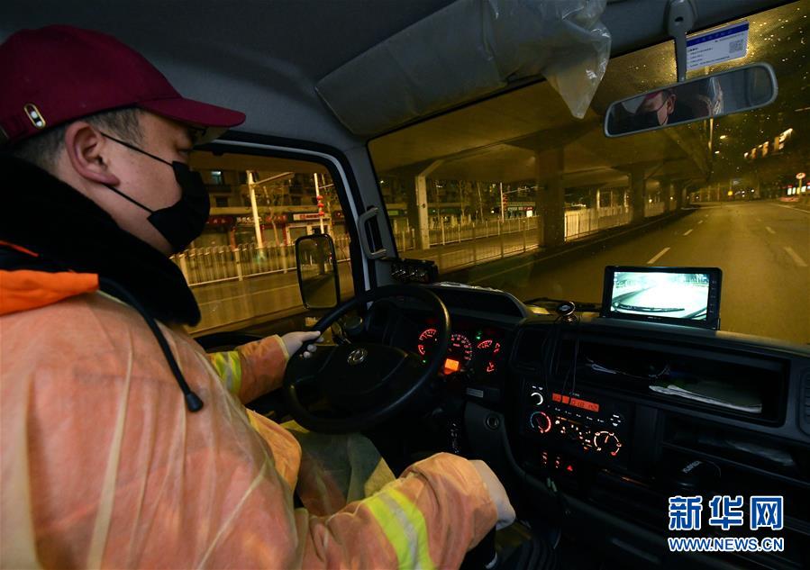 2月1日晚上,江岸环卫集团工作人员厉军驾驶垃圾清运车开往9公里外的垃圾转运站。 2月初的武汉街头人迹寥寥,只有亮橙色工装和淡蓝色口罩包裹下的环卫工人时不时出现在马路边。非常时期,他们坚守岗位,为保持城市的清洁默默奉献。 新华社记者 李贺 摄