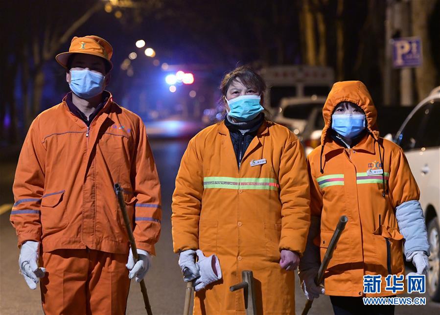 2月3日早6点,三位刚清扫完毕的环卫工人在武汉市六合路合影。新华社记者 李贺 摄