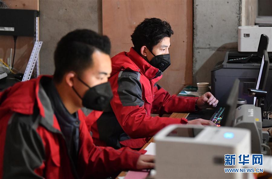 徐国斌(右)查询货品信息(2月3日摄)。 新华社记者 刘潇 摄