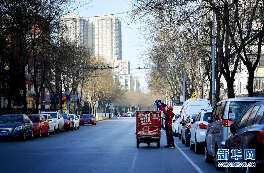 徐国斌在一小区门口等待收货人(2月3日摄)。 新华社记者 刘潇 摄