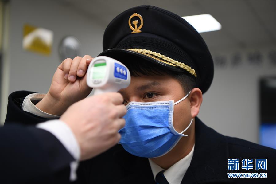 2月3日,李政在长沙南高铁车间派班室进行值乘前的体温检查。 新华社记者 薛宇舸 摄