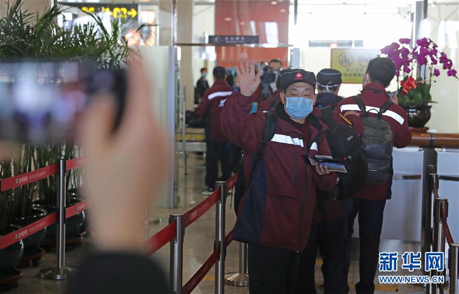 2月4日,中国医科大学附属第一医院的医护人员在沈阳桃仙机场与同事挥手告别。 当日,根据国家卫健委的任务要求,由中国医科大学附属第一医院的34名医护及管理人员、中国医科大学附属盛京医院的10名医护人员、中国医科大学附属口腔医院的两名保障人员组成的辽宁国家紧急医学救援队在沈阳桃仙机场出发,赶赴湖北。 新华社记者 杨青 摄