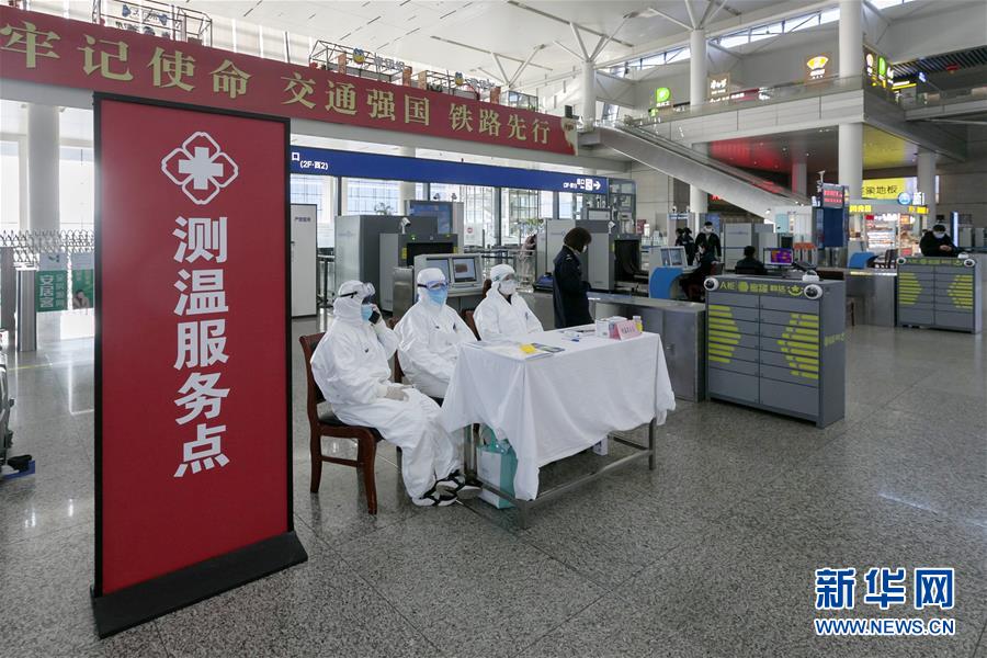 2月4日拍摄的上海虹桥火车站候车厅安检口处设置的测温服务点。 当日,铁路上海站客流继续保持低位,当天停运旅客列车254对,预计发送旅客2万人,到达旅客8万人。 新华社发(王翔摄)
