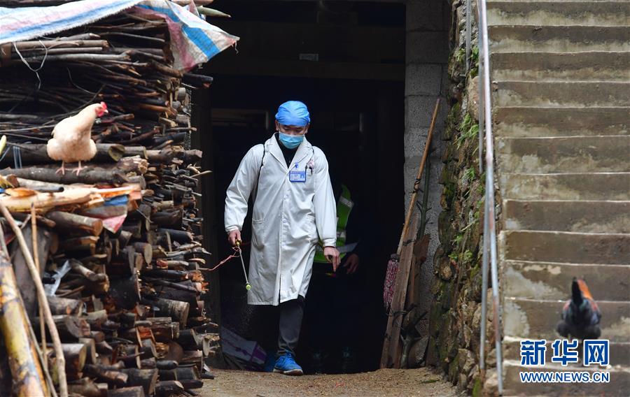 2月4日,广西融水苗族自治县杆洞乡党鸠村卫生院医生梁永健在给苗寨消毒。 连日来,广西融水苗族自治县广大党员干部、医务人员、志愿者和当地群众一道,构建乡村地区联防联控网络,全力阻击新型冠状病毒感染的肺炎在当地苗寨传播。 新华社记者 黄孝邦 摄