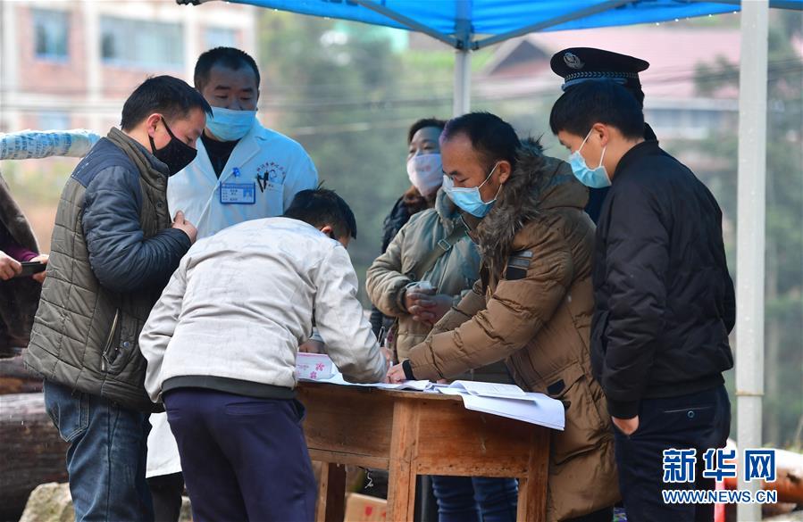 2月4日,工作人员在广西融水苗族自治县杆洞乡党鸠村对过往村民进行体温测量和登记。 连日来,广西融水苗族自治县广大党员干部、医务人员、志愿者和当地群众一道,构建乡村地区联防联控网络,全力阻击新型冠状病毒感染的肺炎在当地苗寨传播。 新华社记者 黄孝邦 摄
