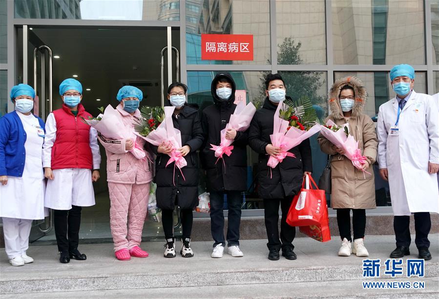 2月4日,郑州大学第一附属医院的5位治愈患者(右二至左三)在隔离病区外与医护人员合影。 当日,经过医护人员的精心诊治和护理,郑州大学第一附属医院5位新型冠状病毒感染的肺炎患者治愈出院。 新华社记者 李安 摄