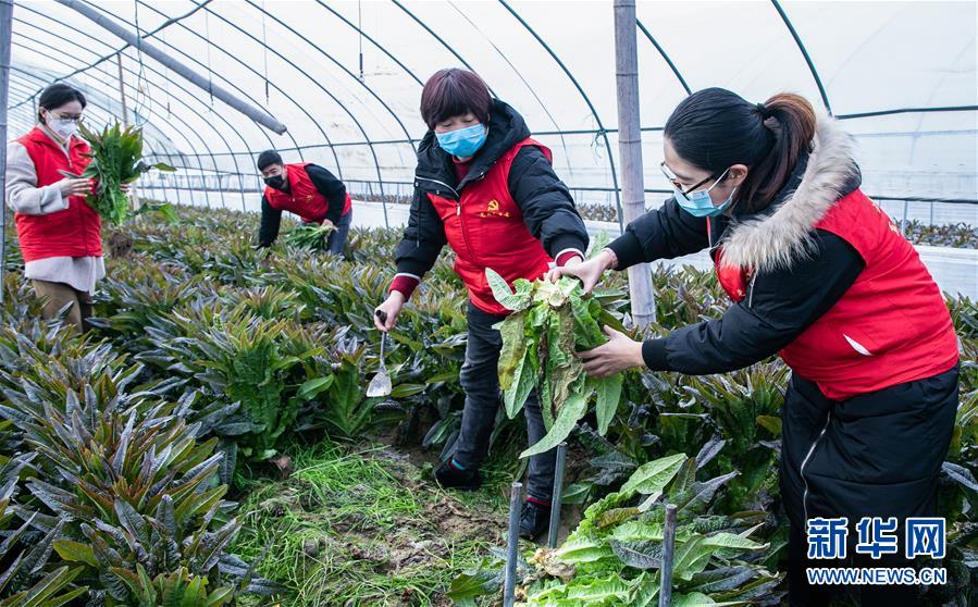 2月4日,党员志愿者们在湖州东林镇东方村红灯圩家庭农场的大棚内帮助采摘蔬菜。 近日,浙江省湖州市东林镇组织党员志愿者帮助受疫情影响而缺少帮工的家庭农场采收蔬菜,减少损失。此外,党员志愿者们还帮助处于居家隔离观察期的群众送菜上门,解决他们的生活困难。 新华社记者 徐昱 摄