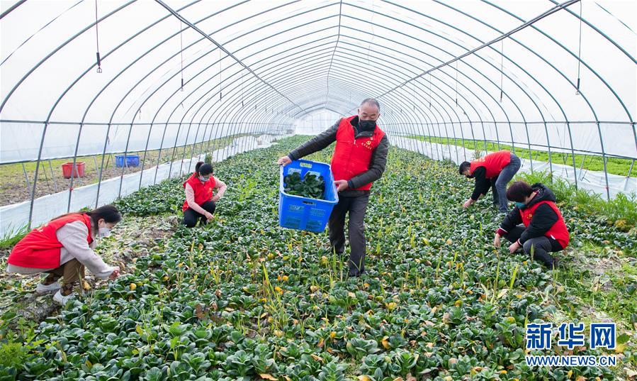 2月4日,党员志愿者们在湖州东林镇东方村红灯圩家庭农场的大棚内帮助采摘蔬菜。 近日,浙江省湖州市东林镇组织党员志愿者帮助受疫情影响而缺少帮工的家庭农场采收蔬菜,减少损失。此外,党员志愿者们还帮助处于居家隔离观察期的群众送菜上门,解决他们的生活困难。 新华社记者 徐昱 摄