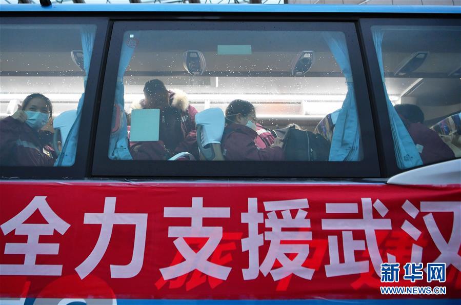 2月4日,医疗队队员乘坐大巴前往机场。 当日,由100名临床内科护士组成的福建省援助湖北护理专业医疗队在福州出征。这支医疗队从福建全省9个设区市和平潭综合实验区迅速抽调选派。 新华社记者 魏培全 摄